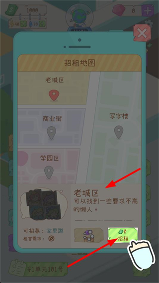 2、在招租地圖界面選擇老城區區域,這里能找到要求不高的租客,點擊招租按鈕,獲取對應的租客候選,繼續租賃流程。