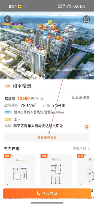 3、在樓盤詳情頁查看項目的基礎信息、主力戶型等內容,找到電話咨詢按鈕,點擊可聯系相關人員了解更多詳情。