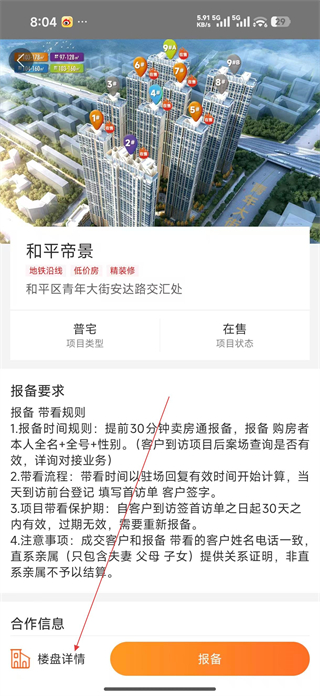2、在報備頁面,了解報備的時間規則、帶看流程等要求,點擊查看樓盤信息,進入樓盤詳情頁查看價格戶型等內容。