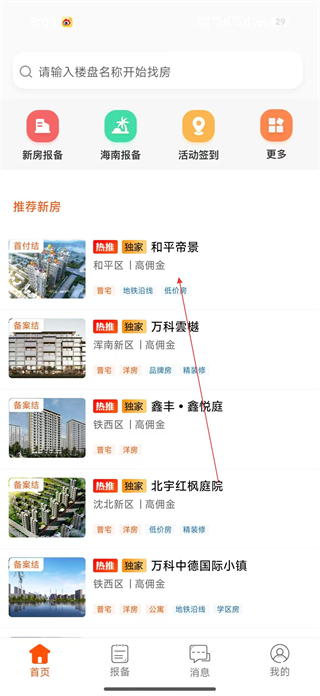 1、點首頁,上方有樓盤搜索欄,下方設新房報備、海南報備等功能,還展示推薦新房,方便找房。