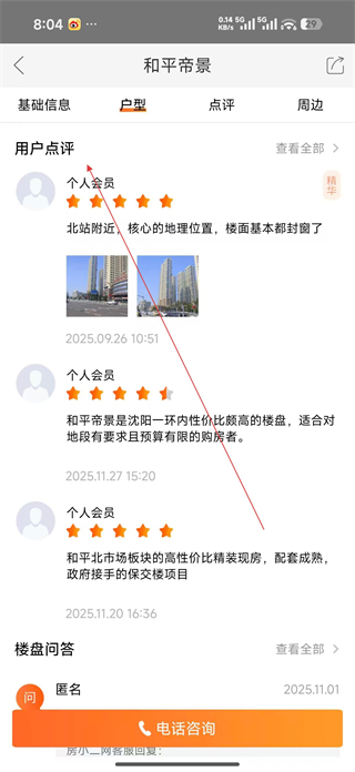 4、切換到點評板塊瀏覽其他用戶對該樓盤的評價內容,了解項目的優勢及定位,為后續的報備或購房做參考。
