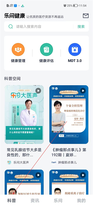 2、登錄后進入首頁,查看健康管理等功能入口,可以點擊科普空間下的視頻學習。