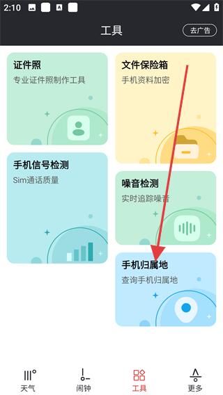 1、進入軟件工具頁面,有很多實用的工具,可以點擊手機歸屬地查詢手機歸屬地。