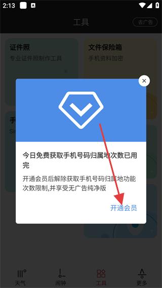 3、若遇到今日免費獲取手機號碼歸屬地次數已用完的提示,可選擇開通會員以解除次數限制,繼續使用查詢功能。