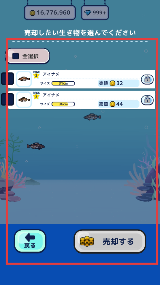 4、釣到魚后進入出售界面,可選擇要出售的魚,也能點擊全選擇全部魚,然后點擊出售按鈕,將魚出售換取金幣。