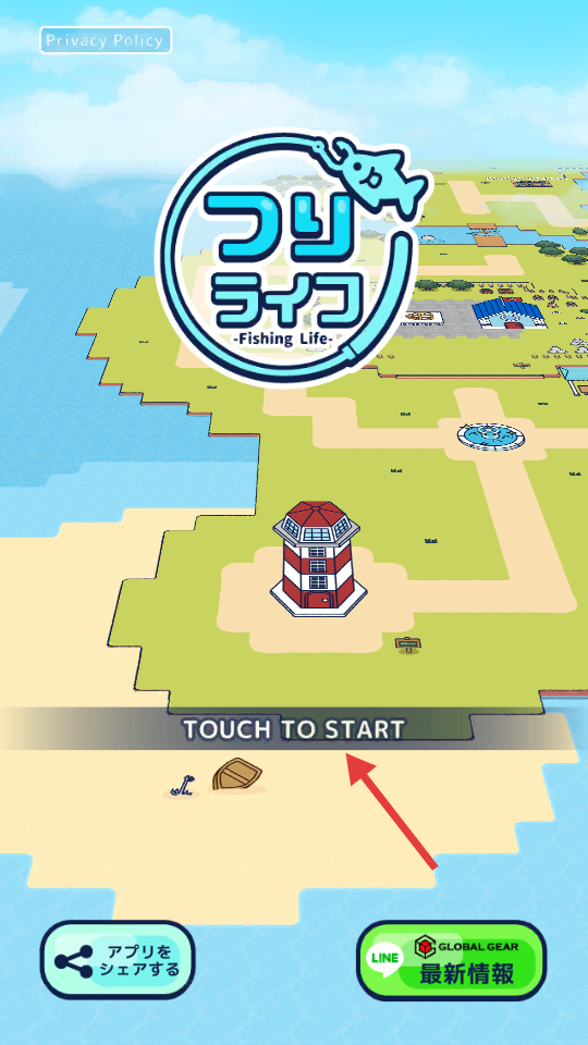 1、游戲開始時點擊TOUCH TO START區域,進入游戲主界面,玩家即可開啟釣魚之旅,準備探索不同海域進行釣魚。