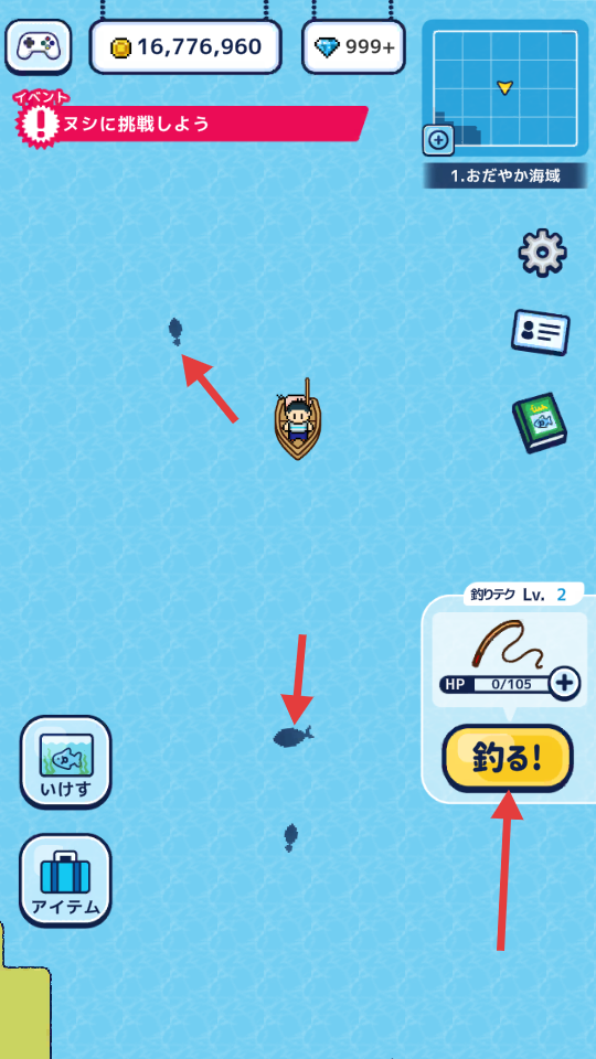 2、進入海域中看到魚的影子后,點擊右側釣魚按鈕,角色會拋出魚鉤開始釣魚,等待魚上鉤推進釣魚流程。