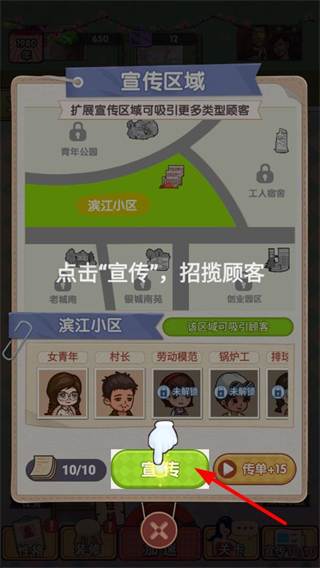 4、進入宣傳區域界面,點擊宣傳按鈕可招攬更多類型顧客,擴展宣傳區域能吸引不同類別的顧客,豐富茶館的客源。