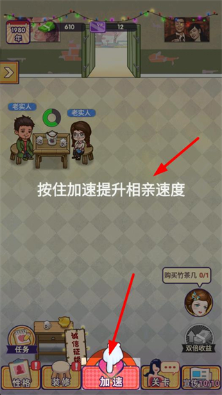 3、在茶館場景里按住加速按鈕,可提升相親速度,推進顧客的相親流程,加快茶館的運營節奏。