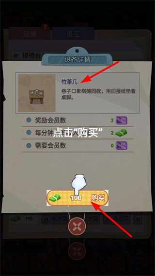 1、在設施界面查看設備詳情,選擇竹茶幾后點擊購買按鈕,花費對應金幣即可獲取該設施,布置茶館內的配套物品。