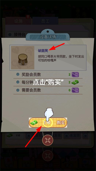 2、在設備詳情界面選擇破圓凳,點擊購買按鈕消耗對應金幣,即可獲取該設施,完善茶館內的座椅類配套物品。