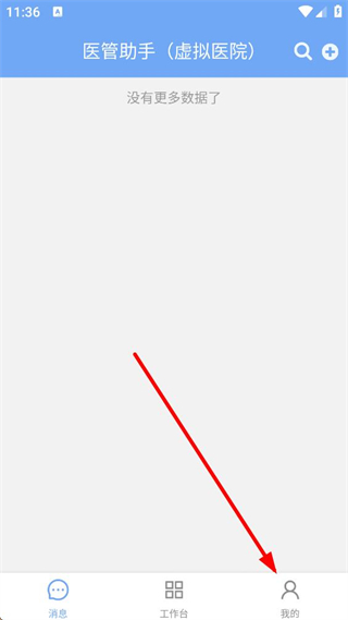 1、進入醫管助手虛擬醫院界面,底部設有消息工作臺我的三個選項,當前界面顯示沒有更多數據,可點擊我的進入對應頁面。