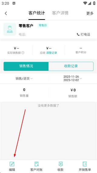 1、進入客戶統計頁面,查看零售客戶的相關信息,包括實際銷售額應收調整記錄等,還能使用編輯客戶對賬等功能。
