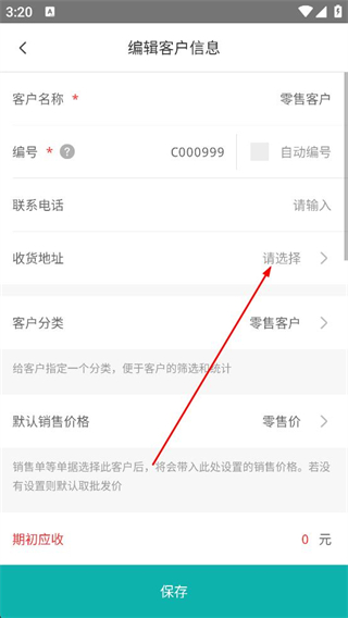 2、點擊編輯按鈕進入編輯客戶信息頁面,可查看客戶名稱編號等內容,補充聯系電話選擇收貨地址,設置客戶分類和默認銷售價格后點擊保存。