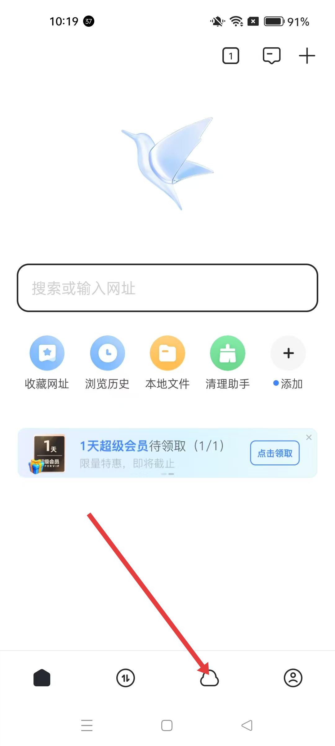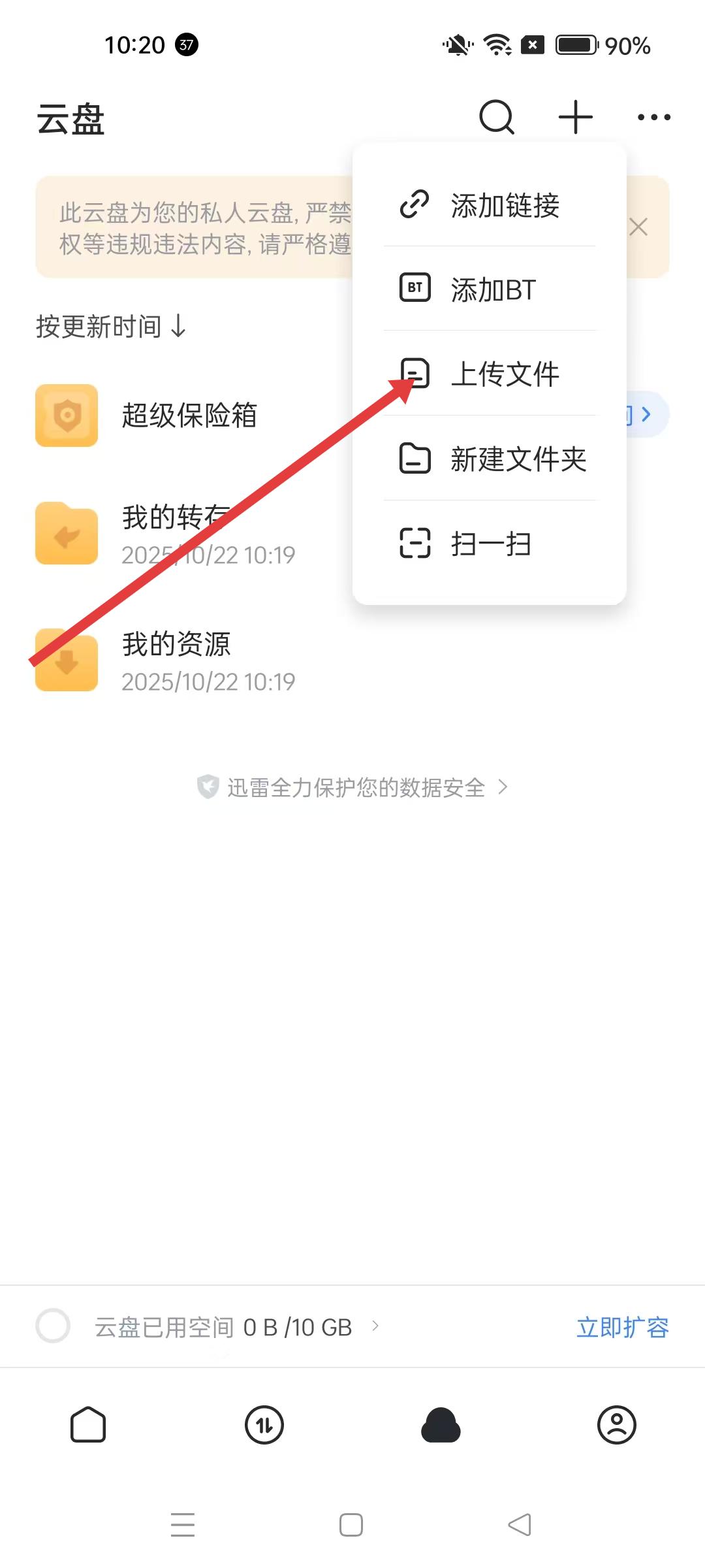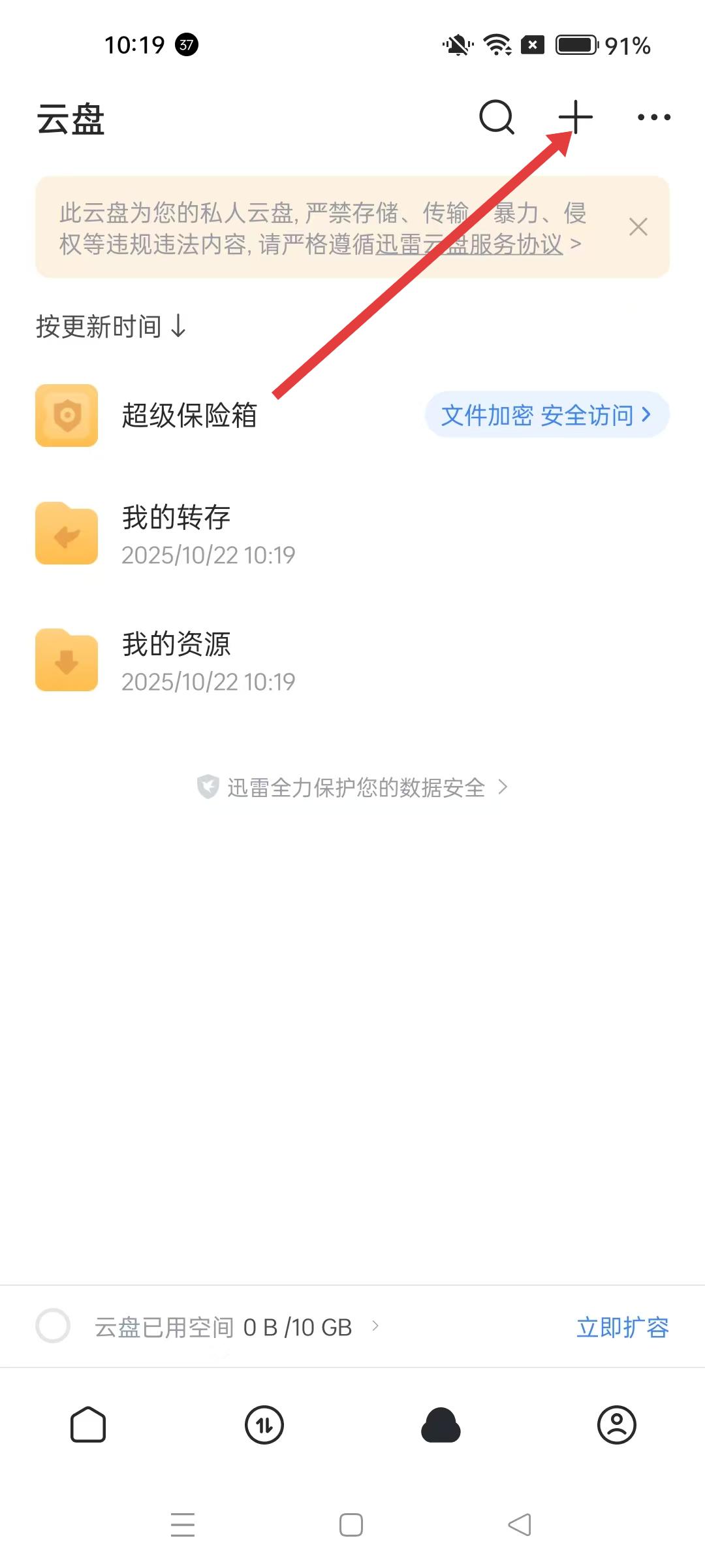 1、打開迅雷后,點擊底部云形圖標,進入云盤頁面,開啟文件上傳操作。
