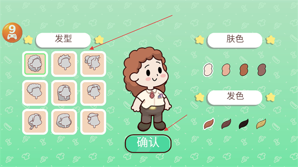 1、在游戲初始界面,可對農場角色的發型、膚色、發色進行選擇搭配,打造出自己喜歡的角色形象,搭配完成后點擊確認。