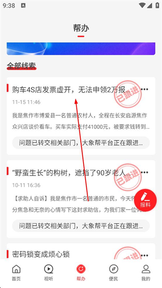 1、進入幫辦頁面,瀏覽全部線索列表,找到購車4S店發票虛開相關線索,點擊該線索,進入大象幫線索詳情頁面查看內容。
