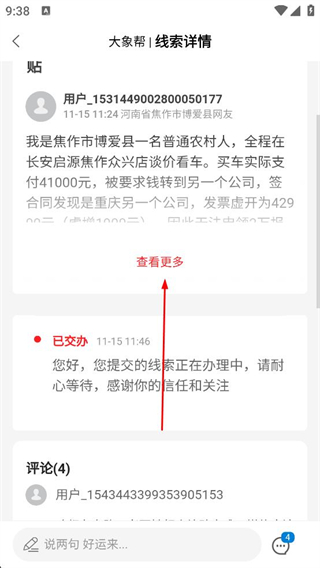 2、在線索詳情頁點擊查看更多按鈕,展開完整的線索描述內容,了解事件的具體情況,同時查看已交辦的進度提示信息。