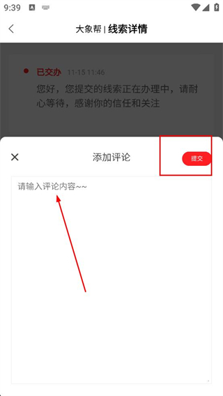 4、點擊評論輸入框在添加評論彈窗中輸入想要發表的內容,確認內容無誤后點擊提交按鈕,完成該線索的評論發布。