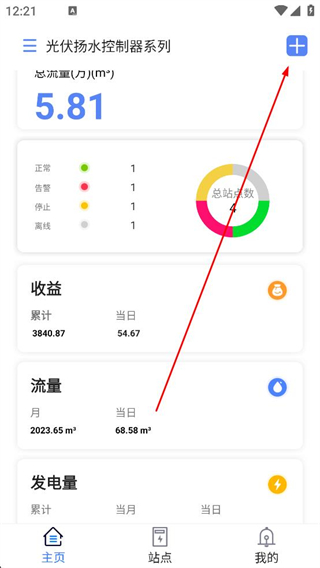 2、登錄后進入主頁查看總流量收益等數據,找到頁面右上角的加號按鈕,點擊進入創建站點的操作頁面。