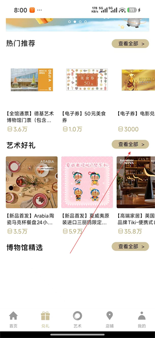 1、進入軟件首頁,瀏覽熱門推薦藝術好禮等板塊內容,選擇感興趣的商品分類,點擊對應板塊的查看全部按鈕,可查看更多相關商品信息。