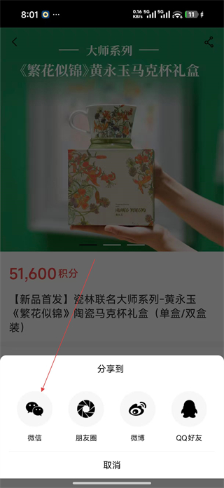4、在商品詳情頁點擊分享按鈕,選擇微信朋友圈微博等分享渠道,將該商品信息分享給他人,完成分享后可返回頁面繼續。