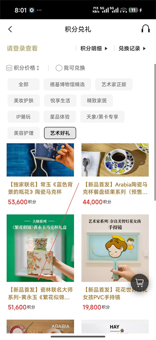 2、進入積分兌禮頁面,通過分類標簽篩選想要兌換的商品,找到藝術好禮分類下的目標物品,查看其所需積分數量。