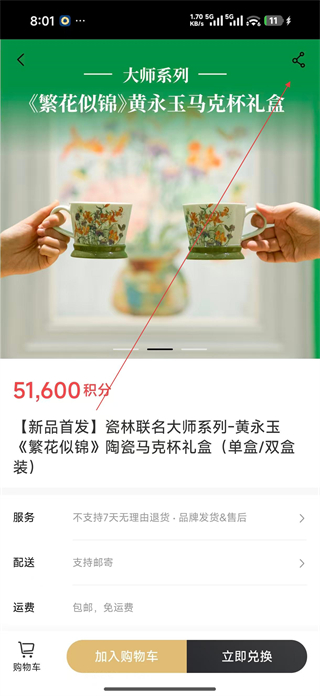 3、點擊商品進入詳情頁,查看商品的具體介紹服務說明配送方式等信息,可選擇加入購物車或立即兌換,點擊分享按鈕。