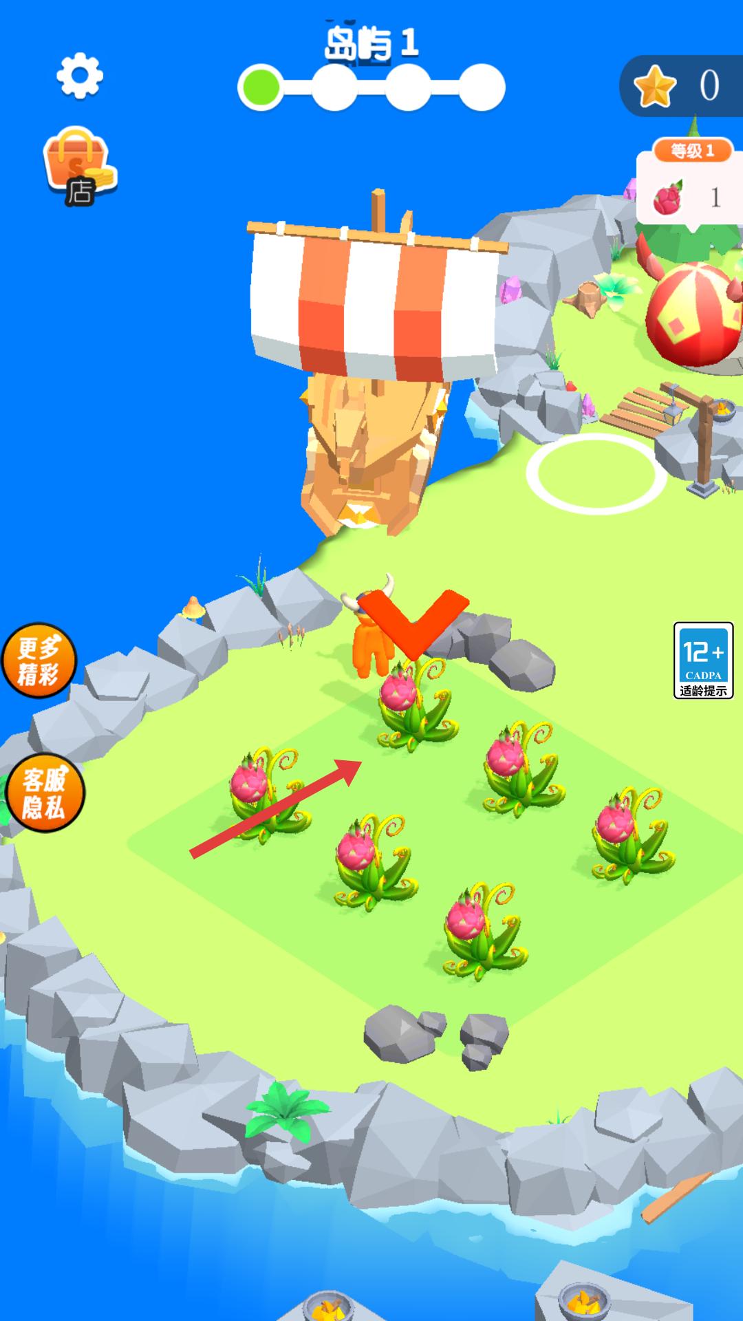 1、在島嶼場景,根據箭頭提示,前往粉色植物區域,收集這些植物,這是初期獲取資源的重要方式,為后續任務做準備。