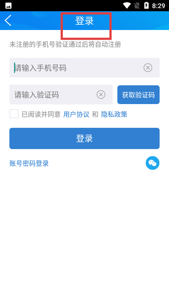 3、進入登錄頁面后按提示輸入手機號碼,點擊獲取驗證碼碼填入對應框內,最后點擊登錄按鈕即可登錄,若有賬號密碼也可選擇賬號密碼登錄方式。