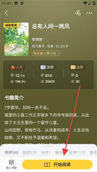 1、找到總有人間一兩風小說,點擊進入書籍詳情頁面,查看書籍簡介、人氣等信息,點擊開始閱讀。