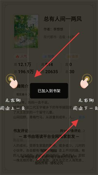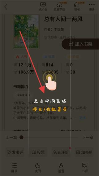 2、在書籍詳情頁面,點擊中間區域,呼出操作菜單,可看到加入書架等功能選項。