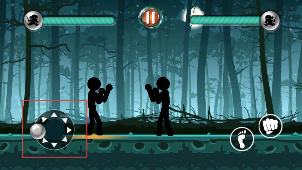 1、點擊帶有三角形的播放按鈕進入游戲,操控火柴人在森林等場景中用左側輪盤調整移動方向,接近對手。