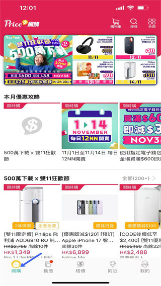 1、網購板塊,展示雙11狂歡節活動及滿減優惠,推薦Philips凈水器、Apple iPhone17等多款商品,方便用戶參與促銷并選購商品。