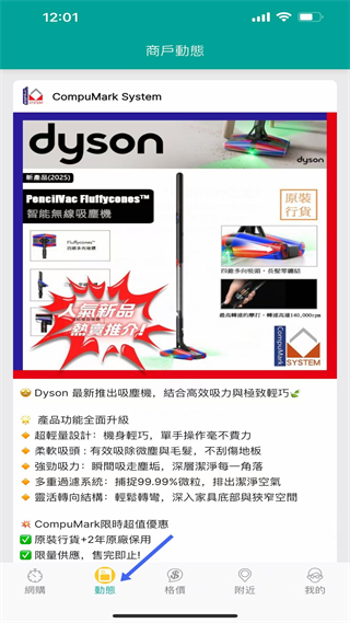 2、動態板塊,呈現Dyson新款吸塵器商戶動態,介紹產品功能升級點及CompuMark限時超值優惠,為用戶提供產品資訊和優惠信息。