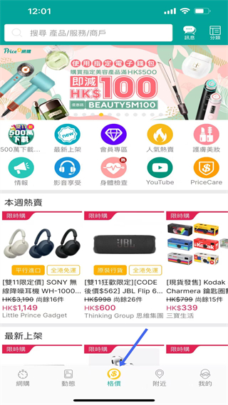 3、價格板塊,有最新上架、會員專區等分類,展示SONY無線耳機、JBL音箱等熱賣商品及價格,助力用戶了解市場價格并選購商品。