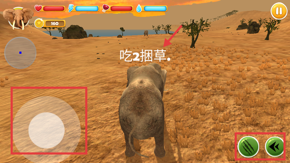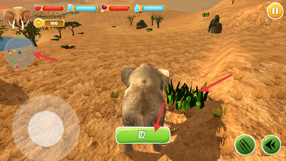 3、找到綠色草堆后,界面會出現吃的按鈕,操控大象靠近草堆,點擊吃按鈕大象就能進食,補充體力完成吃草任務推進游戲進程。