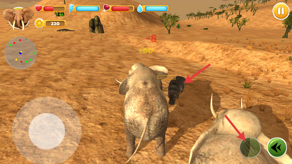 4、除了吃草還會遇到其他動物比如河馬,可利用右側攻擊類按鈕與河馬互動,互動過程中能獲得分數等獎勵,同時要關注自身狀態確保大象安全。