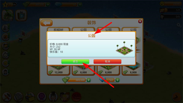 4、進入裝飾界面選擇公園,查看其價格等屬性,消耗8000現金點擊建造按鈕,可在小鎮內添加公園裝飾,提升快樂值。