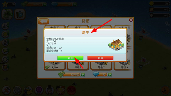 1、在建筑界面選擇房子,查看其價格大小等信息,消耗5000現金點擊建造按鈕,即可開啟該建筑的建造流程,積累對應XP。