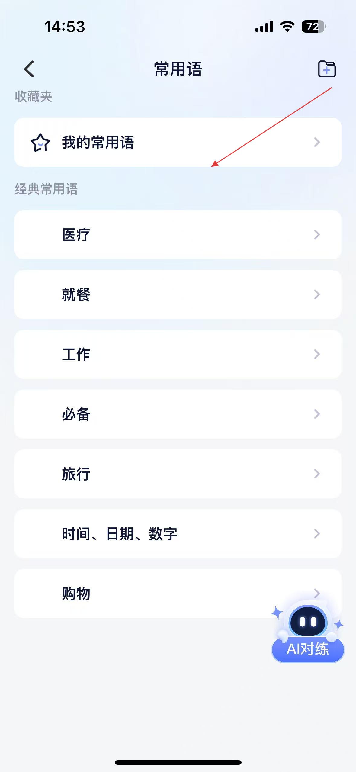 2、常用語界面,有我的常用語和經典常用語分類,經典常用語包含醫療、就餐等多個場景的常用語。