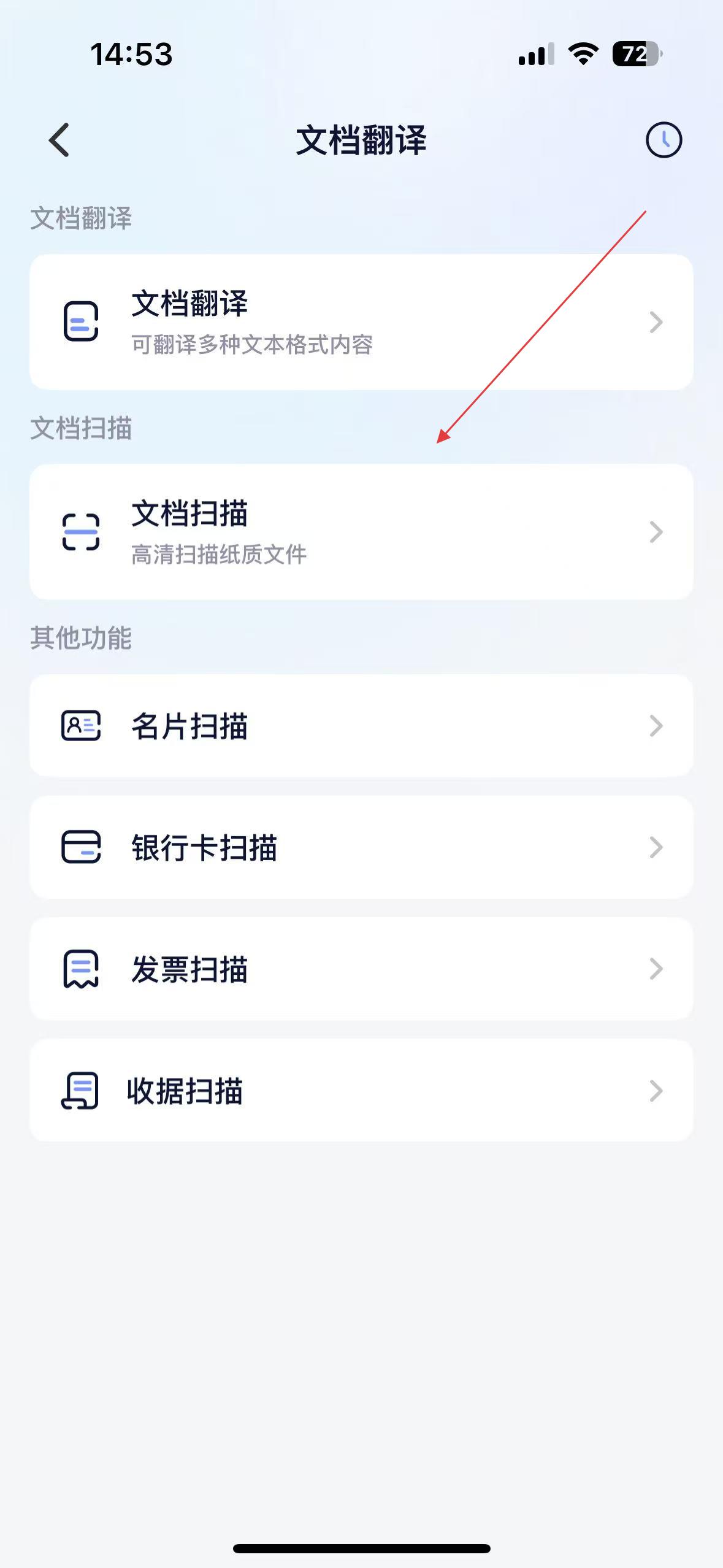 3、文檔翻譯界面,有文檔翻譯、文檔掃描等功能入口,文檔翻譯可翻譯多種文本格式內容,方便用戶進行文檔和各類卡片的翻譯與掃描操作。