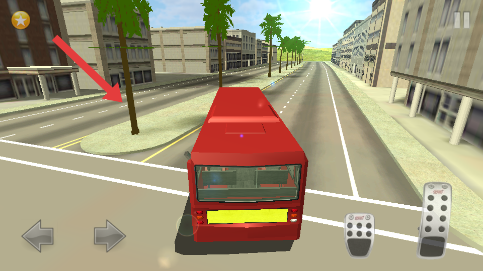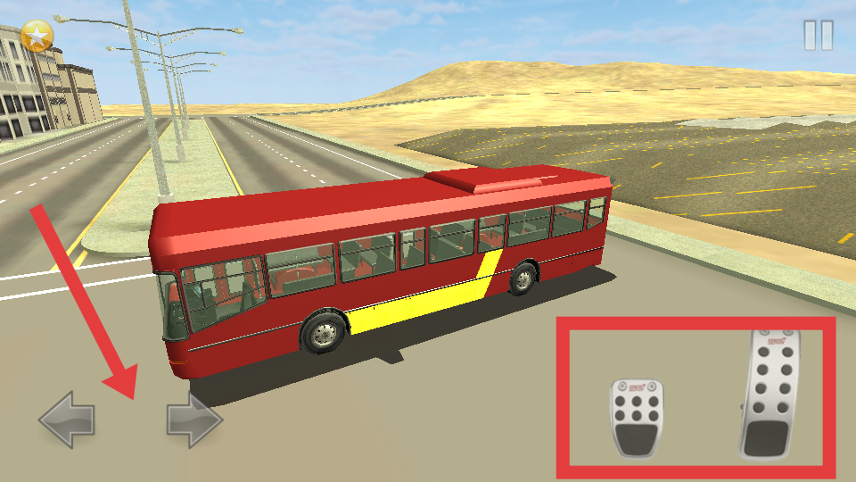 2、通過屏幕左側的左右箭頭按鈕控制巴士的行駛方向,右側的踏板按鈕控制巴士的加速與減速,在道路上駕駛巴士前進。