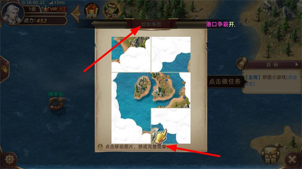 2、需繪制海圖,點擊移動圖片拼成完整圖案,完成拼圖小游戲,推進航海的進程。