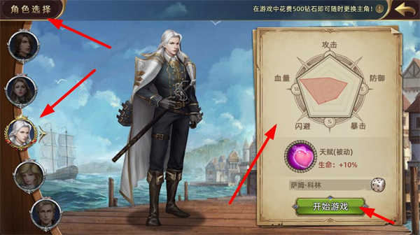 1、游戲開始可選擇角色,查看角色的攻擊、血量等屬性,選擇后點擊開始游戲開啟航海冒險。