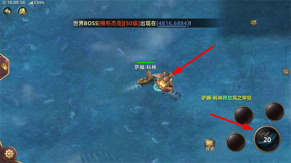 3、在海上可進行戰斗,操控船只釋放技能,如薩姆科林釋放風之牢獄,與敵人展開戰斗。