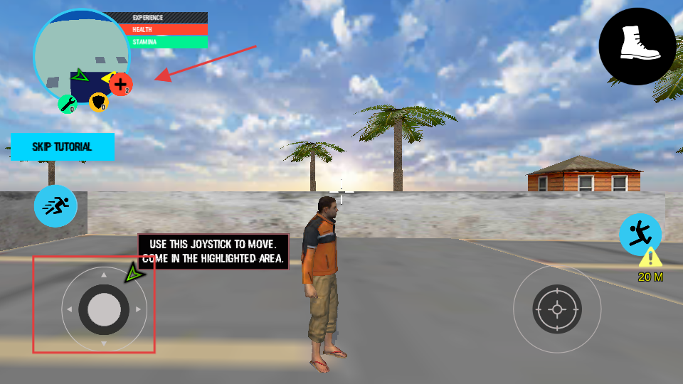 1、通過屏幕左側的虛擬搖桿操控角色移動,按照提示移動到指定區域,熟悉游戲的移動操作方式,左上角小地圖可以查看角色位置和目標地點。