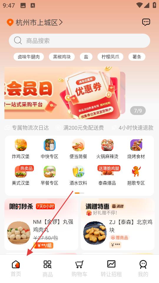 1、首頁定位為杭州市上城區,有商品搜索欄,展示會員日優惠券活動,還有炸雞漢堡、中快專區等分類入口,以及限時秒殺。