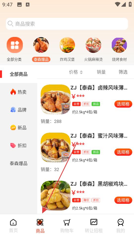 2、商品頁面可通過全部分類、泰森爆品等標簽篩選,能按價格、銷量排序,展示了鹵辣風味薄、蜜汁風味薄… 等泰森系列商品。
