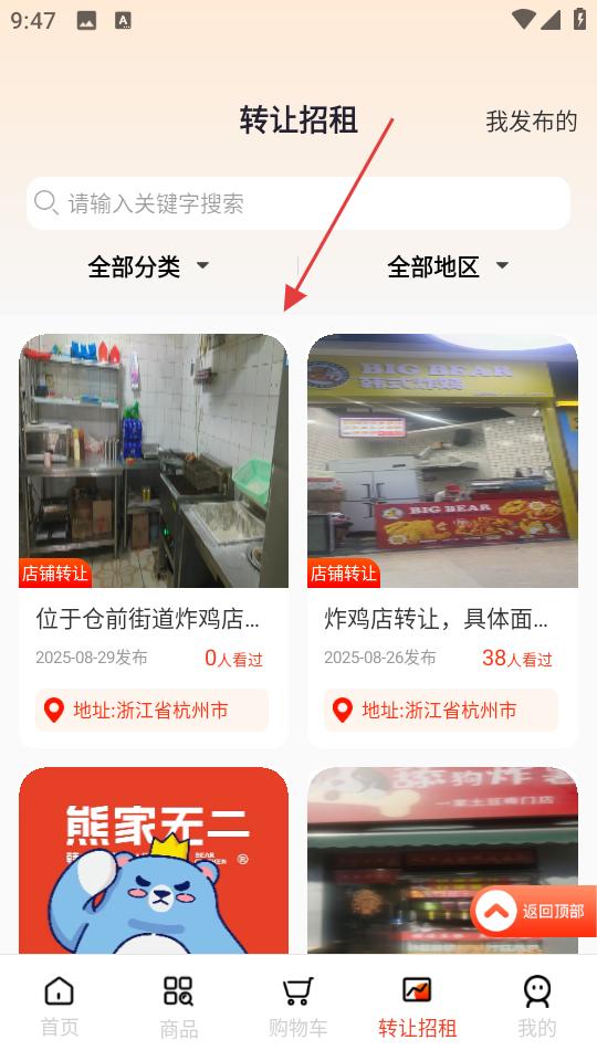 3、轉讓招租頁面可搜索關鍵字,按分類和地區篩選,展示了位于倉前街道炸雞店等轉讓信息,標注發布時間、瀏覽人數和地址。